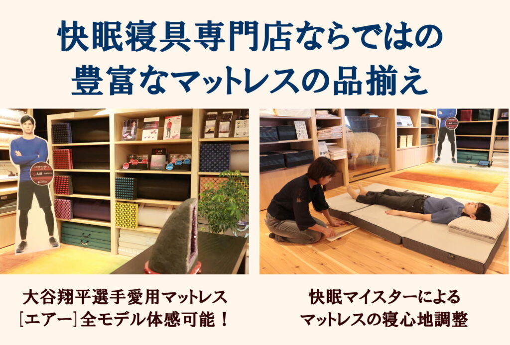 当店では大谷翔平選手が愛用している西川の[エアーSX]をはじめ、40種類以上のマットレスを取り揃えています。