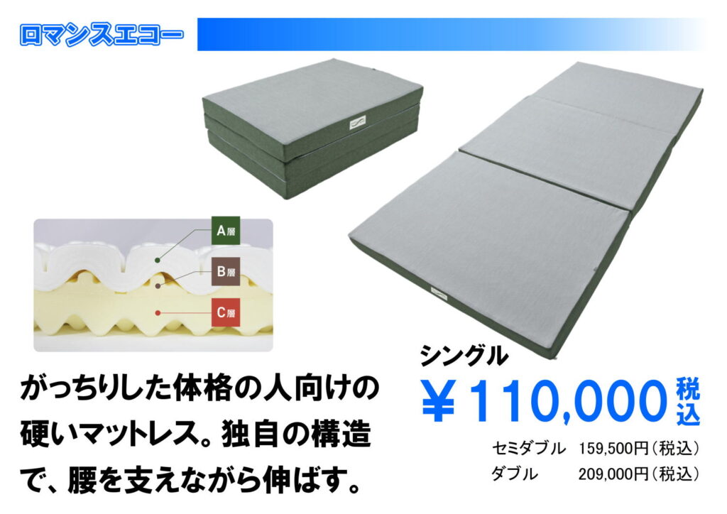 当店で最も硬いマットレス。体重80㎏以上の方で、しっかりと身体を支えたい方にオススメ。