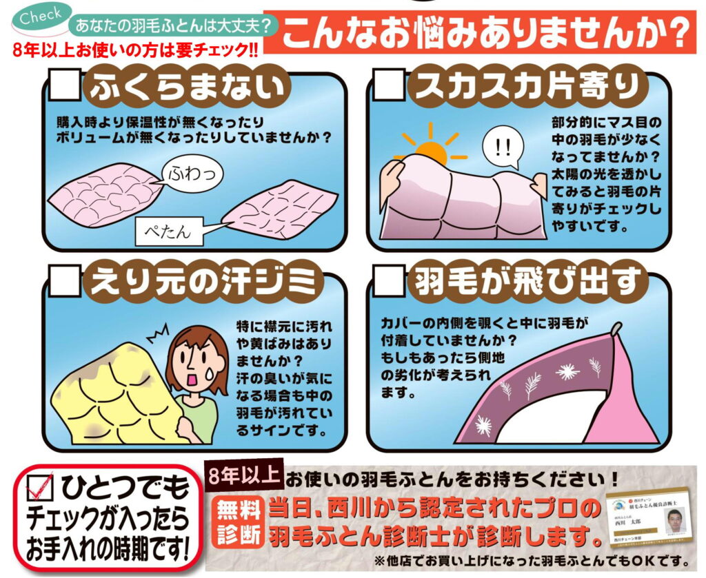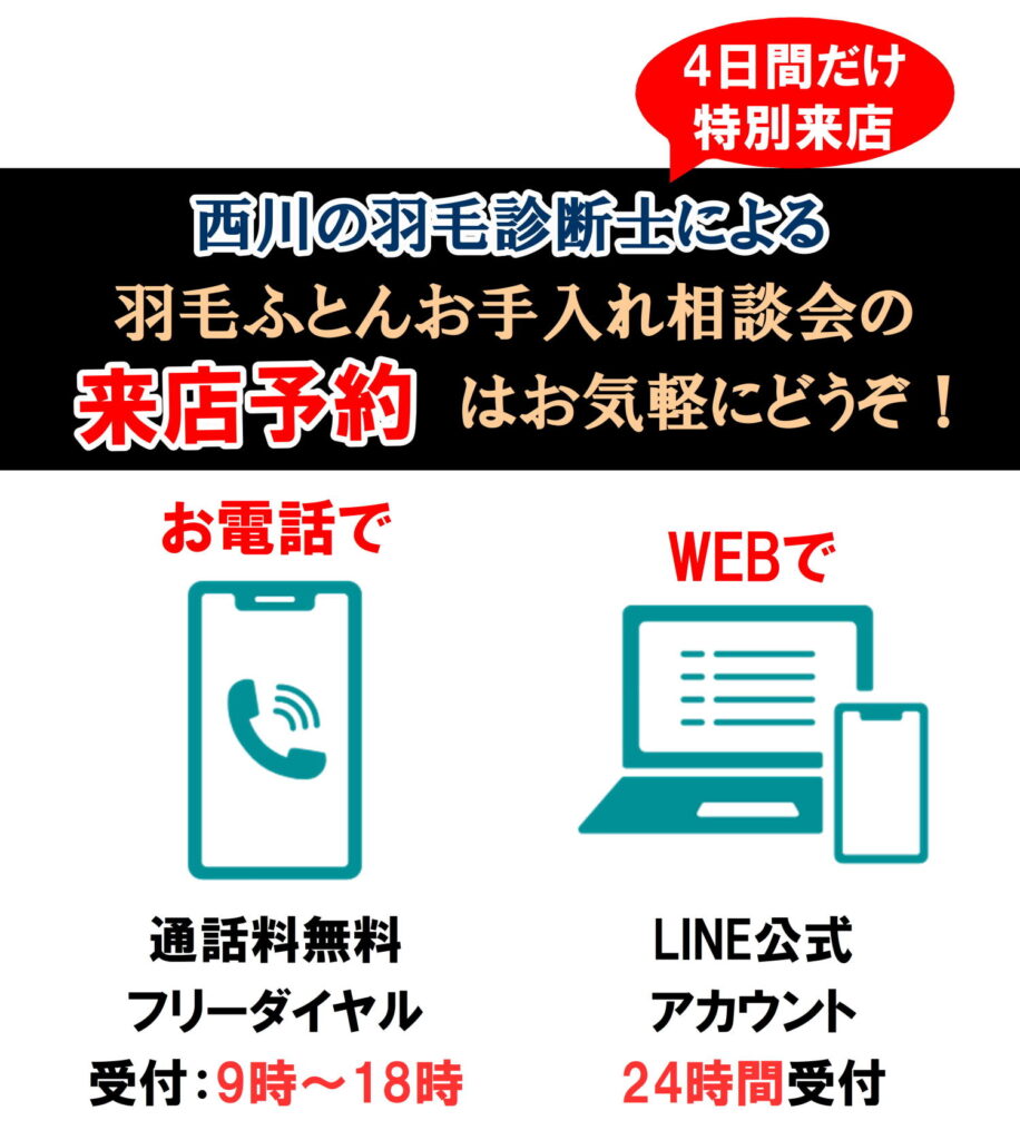 ❶4日間限りで【西川の羽毛診断士が特別に来店】します!