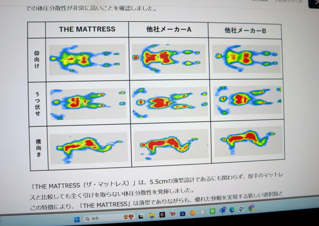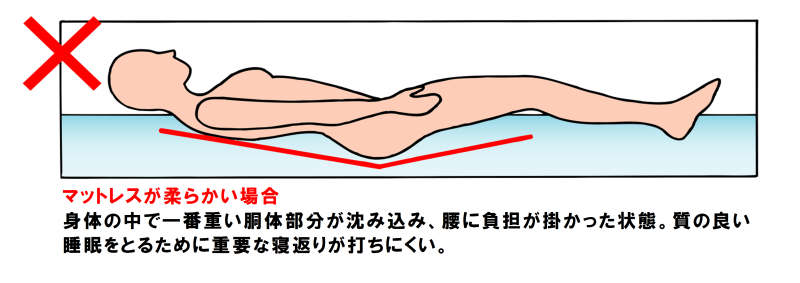 低反発マットレスなどでは、柔らかさによって体圧が均等に分散されているように見えますが、実際には余分な沈み込みが生じ、身体に負担が掛かっているケースが多く見受けられます。