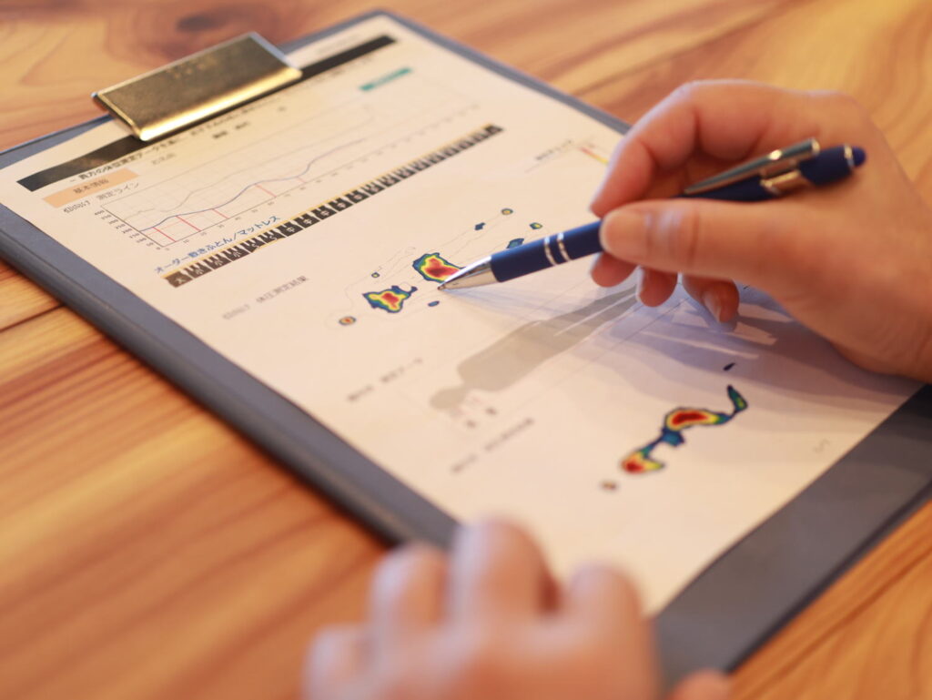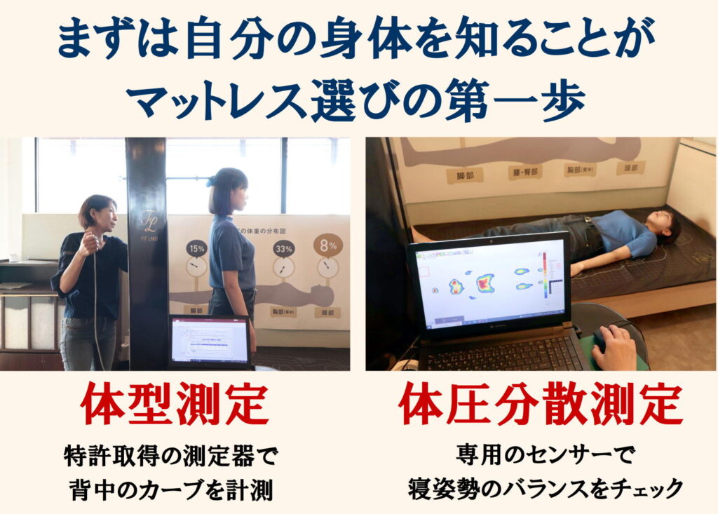 当店では、ご来店いただいたお客様一人ひとりに対して、体型(背中のカーブ)と体圧分散測定を行い、その結果に基づいて最適なマットレスを提案するという、科学的なアプローチを採用しています。