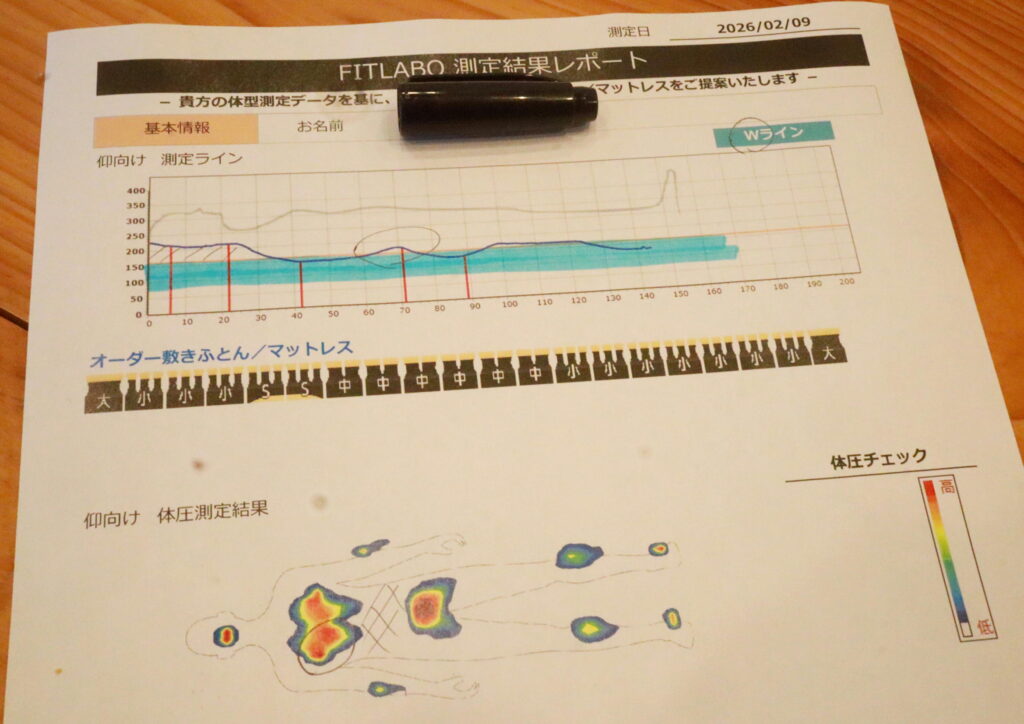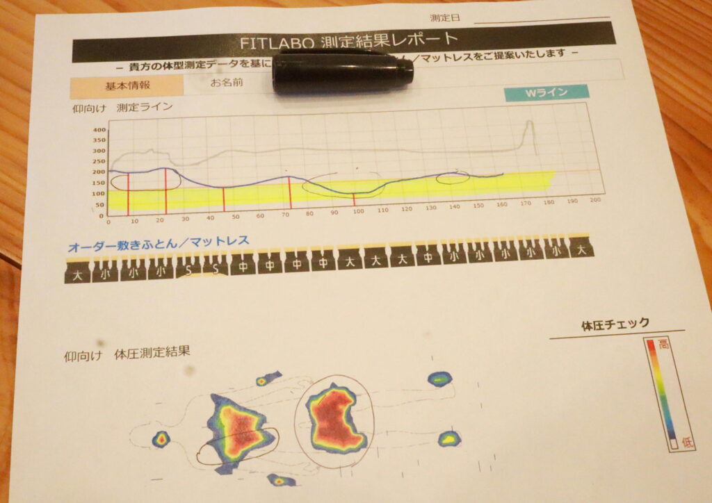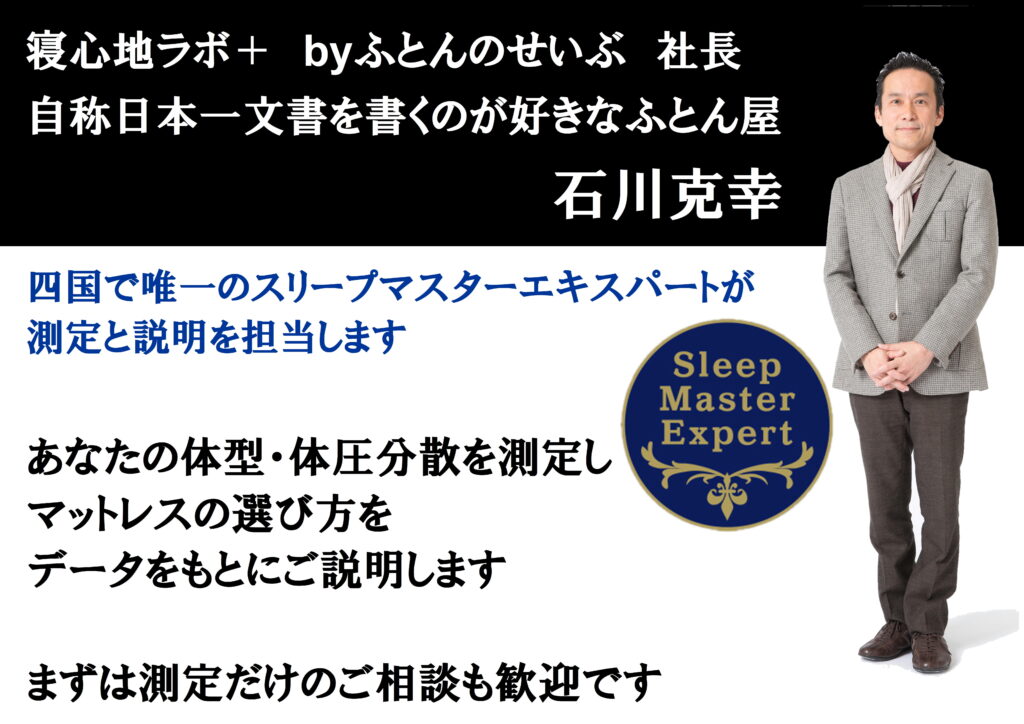 私は以前、松山から来られた競輪選手にマットレスをご提案したことがあります。その経験をお伝えした上で、息子さんも実際に体型・体圧分散測定をしてからマットレスを選び、体型に合わせた寝心地調整ができることをお伝えしました。