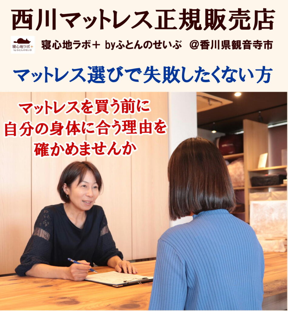 枕とマットレスのご提案だけでなく、寝姿勢に関する様々なアドバイスをして差し上げたところ、「遠く(徳島)から1時間半かけてわざわざ来て良かった」と喜んで帰って行かれました。