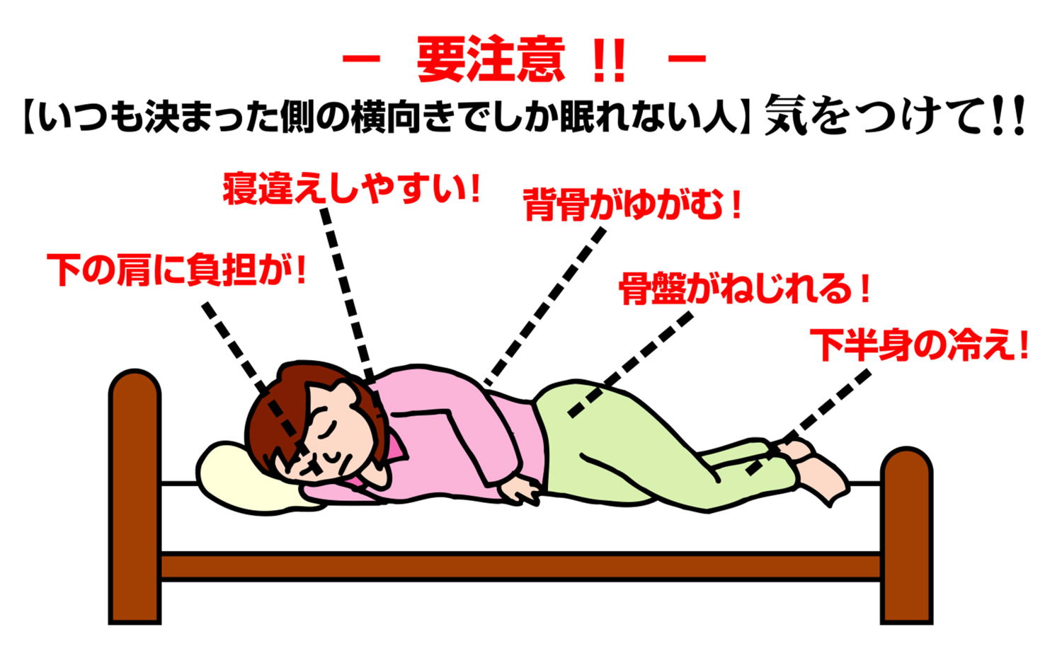 課題の推察: お尻の突出が仰向け寝を阻害し、無意識に右下寝が増えている