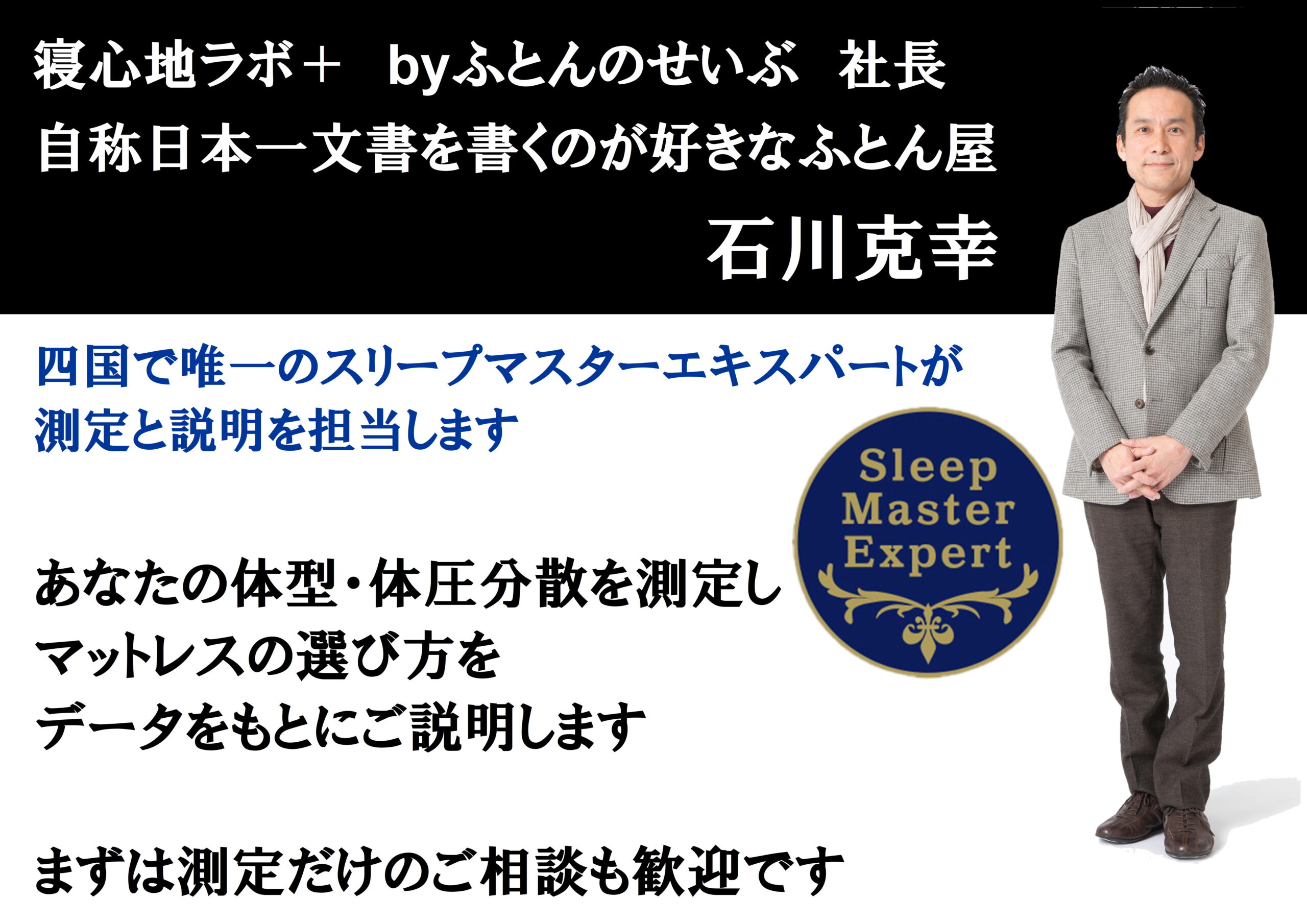 枕とマットレスのご提案だけでなく、寝姿勢に関する様々なアドバイスをして差し上げたところ、「遠く(徳島)から1時間半かけてわざわざ来て良かった」と喜んで帰って行かれました。