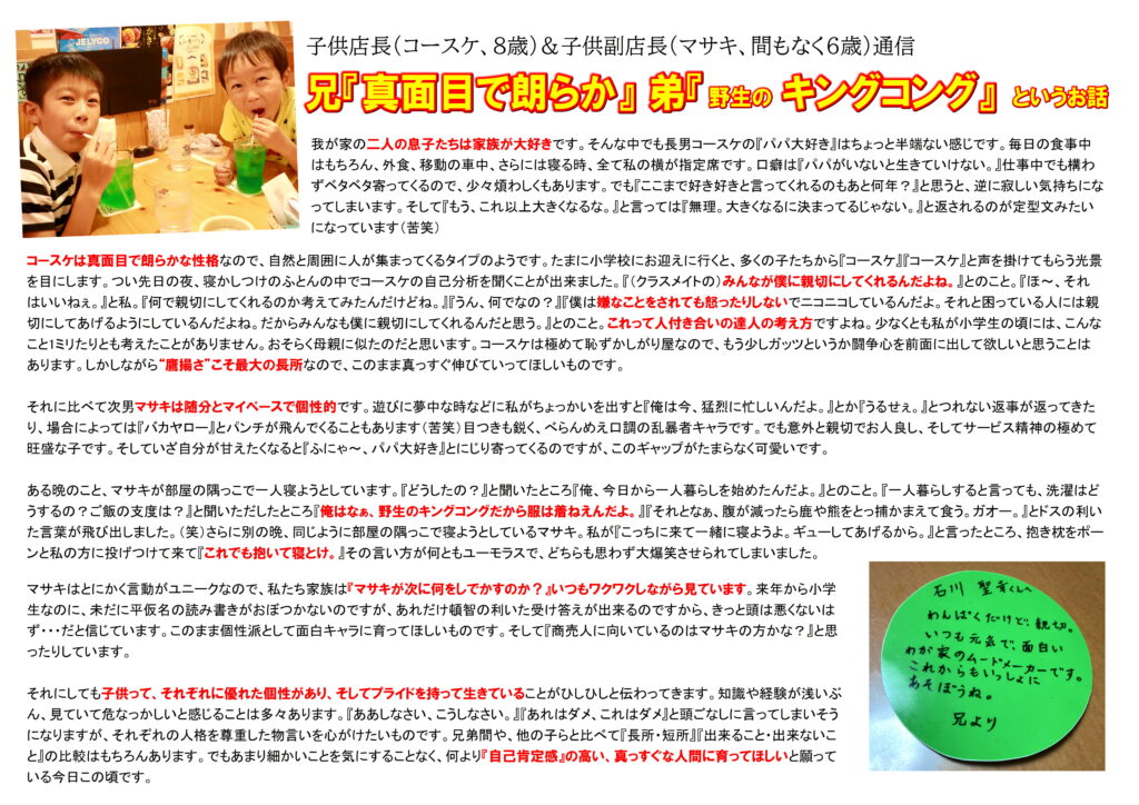 『子供店長&子供副店長通信』は、我が家の2人の息子の成長記録、そして私の子育て論を綴ったものです。