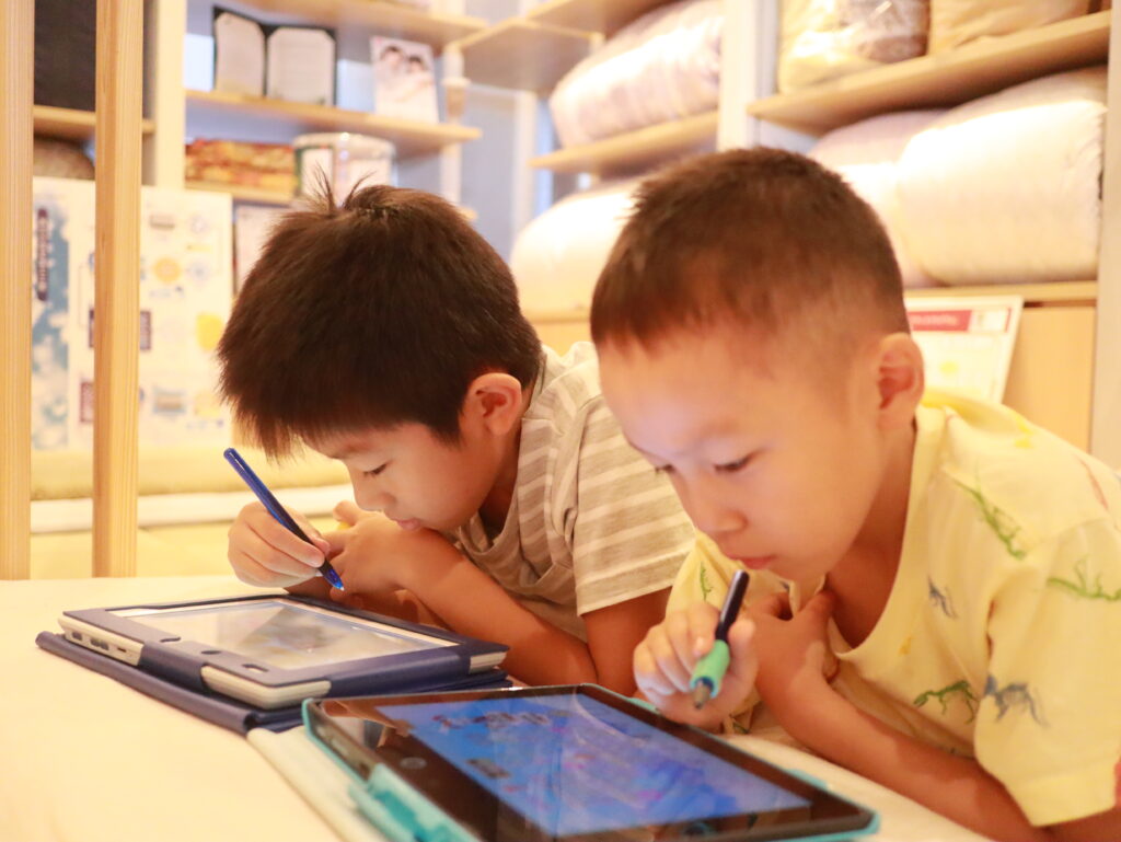 静かだなぁと思えば、体感用のマットレスに寝転んでニンテンドースイッチをしていたり 。